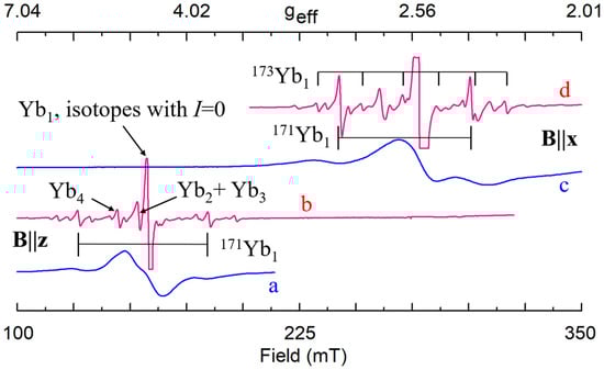 As an example of the multi-center spectra let’s consider ion Nd3+ in LN [91,92,93] (Figure 2). Every spectrum consists of a single dominant line labeled with the number 1 and many satellite lines of smaller intensities. The positions of the dominant line have the same value of the resonance field for B||x and B||y (φ = 90 deg), whereas positions of other lines do not coincide. We have to suppose that the single line #1 belongs to the axial C3 symmetry center, Nd1.