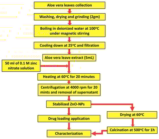 The Aloe barbadensis plant was rinsed 5 times with distilled water to remove any impurities. Then, 2 g of the cleaned leaves were collected, dried, and grinded into a fine powder. The obtained powder was dispersed in 100 mL of deionized distilled water with magnetic stirring and then boiled for 10 min at 100 °C. After allowing the extract to cool down at room temperature, it was filtered through a muslin cloth to collect the clear extract. An Erlenmeyer flask with 50 mL volume of 0.1 M zinc nitrate solution was prepared to react with 5 mL of aloe vera leaves extract through continuous magnetic stirring at 60 °C for 20 min. The color of the obtained solution changed from green to yellow, which confirmed the formation of ZnO-NPs stabilized by the aloe vera leaf extract []. The reaction mixture was centrifuged at 4000 rpm for 20 min followed by removal of the supernatant. ZnO nanoparticles were washed 3 times with distilled water and dried in an oven at 60 °C. Finally, the obtained powder was calcined at 500 °C for 1 h, and the formed black particles were collected for downstream processing. The obtained stabilized ZnO-NPs were allowed to interact with polyethylene glycol for 24 h with subsequent purification by dialysis against water, as depicted in Figure 1.