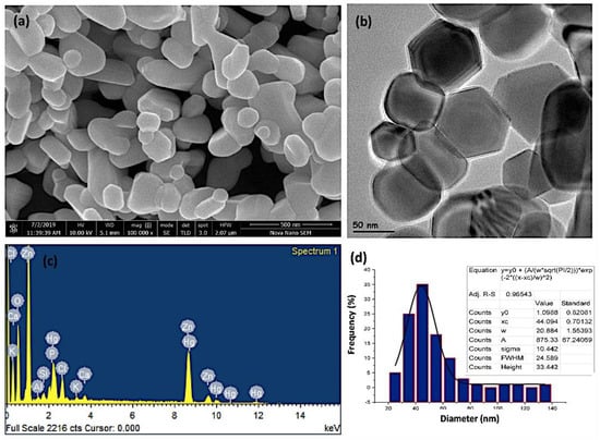 (a) Scanning electron microscopy (SEM) images, (b) high-resolution transmission electron microscopy (TEM) image, (c) EDAX (energy dispersive X-ray analysis) semi-quantitate compositional analusis, and (d) the particle size distribution of the investigated ZnO-NPs.