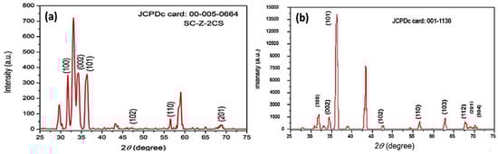 X-ray diffraction patterns of the investigated nanoparticles, where (a) the as prepared ZnO-NPs and (b) the ZnO-NPs after calcination at 500 °C.