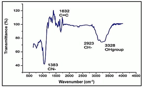 The average crystalline size was calculated by the Scherrer equation (crystallite size = Kλ/βcosθ, where K is a constant, λ is the wavelength of the used X-ray source of 1.541 Å, θ is the angle of diffraction, and β is the peak broadening at full width of max intensity FWHM (β) value of 0.75). A simple estimation of crystallite size from the breadths of a diffraction peak was obtained. It was observed from the results that the average crystallite size was about 37.86 nm [].