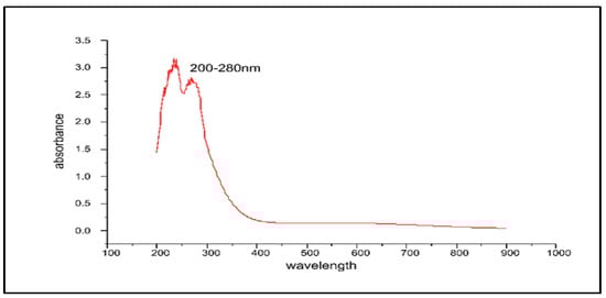 The UV-Visible spectrum of the ZnO-NPs synthesized by Aloe barbadensis leaf extract at a maximum wavelength of 200–280 nm.