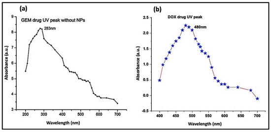 Absorption spectrum of (a) doxorubicin (DOX) and (b) gemcitabine (GEM).