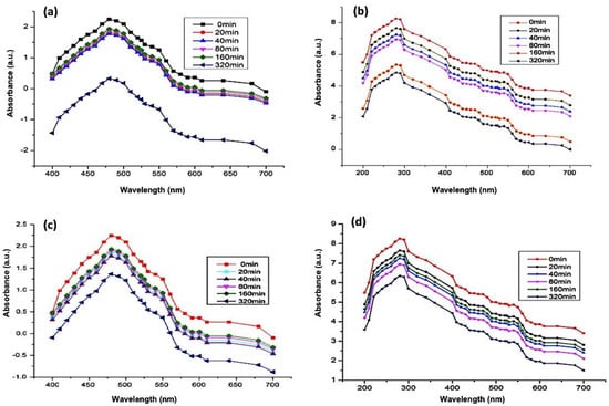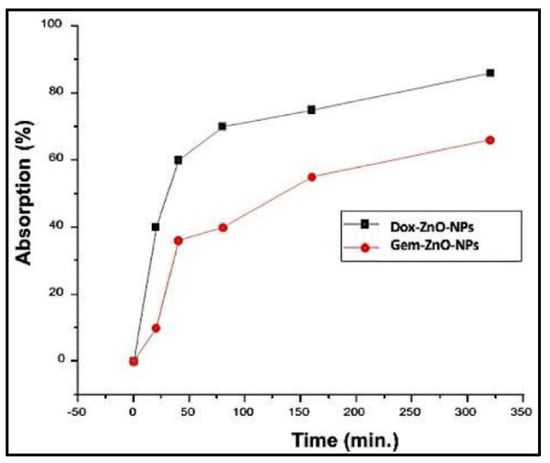 UV-Vis spectrophotometry of DOX (Figure 6a) and GEM (Figure 6b) showed absorbance peaks at 480 nm and 283 nm, respectively. As mentioned in the previous section, the ZnO-NPs can be detected at a wavelength of 325 nm. Subsequent absorbance readings of solution which contained Aloe vera DOX and ZnO-NPs were recorded at discrete time intervals ranging from 0 min to 320 min. The lowering of the absorbance peak of DOX over time indicates the loading of the drug on the ZnO-NPs (Figure 7a). Likewise, the UV-Vis absorption spectrum of the solution containing GEM and ZnO-NPs was also recorded as shown in Figure 7b. It was observed from the results that GEM was successfully loaded on the surface of ZnO-NPs, as indicated by a lowering in the intensity of the absorbance peak (Figure 7b). Similarly, UV-Vis spectrophotometric measurements were observed during the PEGylation of drugs along with the ZnO-NPs. A decrease in the intensity of the absorbance peaks of DOX and GEM guaranteed the generation of DOX-PEG-ZnO-NPs (Figure 7c) and GEM-PEG-ZnO-NPs (Figure 7d), respectively. In the case of DOX-ZnO-NPs, the ZnO-NPs transferred their energy to DOX, which resulted in the reduction of the the corresponding absorption peak due to the π–π interaction phenomenon among the DOX molecules. It was also assumed that a similar phenomenon can take place in the case of GEM [].