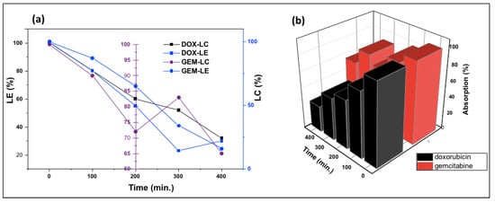 (a) Loading capacity (LC), loading efficiency (LE), and (b) relative absorption of gemcitabine and doxorubicin PEGylated ZnO-NPs.
