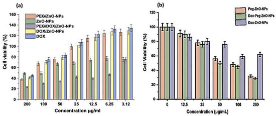Many plant extracts and green synthesized NPs have been reported to reflect anticancer and antioxidant properties []. Furthermore, Aloe vera leaf extract-based ZnO-NPs have been reported to be associated with the inhibition of cellular malignancy [,]. Green-synthesized NPs could exert their antitumor potential through the production of reactive oxygen species involved in intracellular signaling, the regulation of cell proliferation, and phagocytosis []. The antiproliferative activity of green-synthesized ZnO-NPs and DOX-PEG-ZnO-NPs was determined in vitro on triple-negative breast cancer cell line MDA-MB-231 using an MTT assay. However, the cytotoxic assay of GEM-loaded formulations was not performed due to its low LC and LE. Also, the cells treated by incubation with different samples of ZnO-NPs at various concentrations exhibited a significant level of cytotoxicity. Similar behavior was observed in the case of DOX-ZnO-NPs (Figure 10). However, DOX-PEG-ZnO-NPs exhibited the best results. These results revealed that ZnO-NPs have anticancer potential that can be enhanced by anticancer drug loading with the subsequent PEGylation. Our findings validate the results of previous studies addressing the strong preferential cytotoxicity of green-synthesized ZnO-NPs against cancer cell lines [].