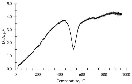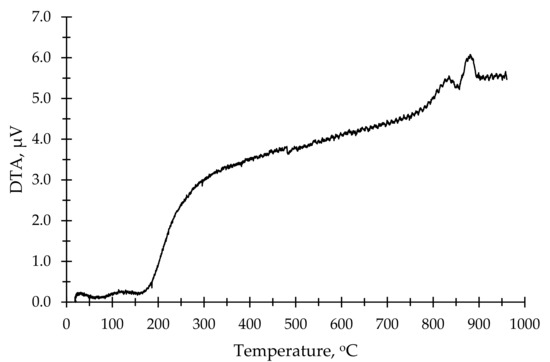 As an aluminum silicate source for the production of AAB, a commercially available kaolin clay from a local distributor SIA “Keramserviss” (Adazi, Latvia) was used. The chemical composition of kaolin is given in Table 1. The kaolin was calcined to obtain metakaolin (MK) in the laboratory using an “Uterna W-80” (Utena, Lithuania) electric furnace. The calcination took place at 850 °C for 2.5 h with heat rate 10 °C/min (up to 100 °C) and 5 °C/min (up to 850 °C). A total of 99% of the kaolin had a particle size lower than 45 μm. DTA thermograms showed phase change of materials at elevated temperatures; for this study, a calcination temperature of 850 °C was based on the thermograms shown in Figure 1 and Figure 2. Figure 1 shows the DTA thermogram of metakaolin, Figure 2 shows the DTA thermogram for zeolite 4A, and Figure 3a shows an SEM micrograph of used metakaolin.