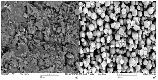 SEM micrographs presenting the microstructure of the used raw materials at 5000× magnification: (a) MK; (b) Zeolite 4A.