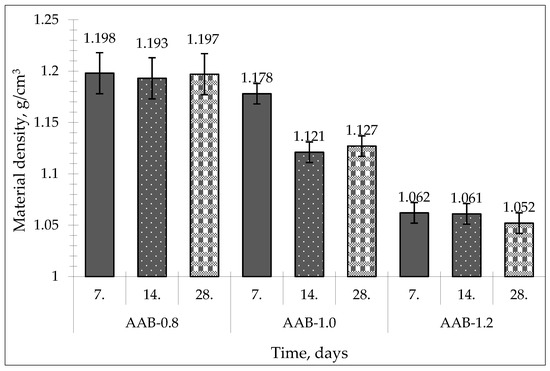 The material densities and compressive strength of the monolithic AABs are shown in Table 4. According to the obtained results, the material densities of the AABs ranged from 1.052 to 1.198 g/cm3 (Figure 4), depending on the liquid-to-solid ratio (L/S) and curing time. As seen in Table 4, the samples of series AAB-1.2 exhibited lower material densities (1.052–1.062 g/cm3) compared to samples of series AAB-0.8 (material density: 1.193–1.198 g/cm3) depending on curing day. The samples of series AAB-1.0 exhibited material densities of 1.127–1.178 g/cm3 depending on time.