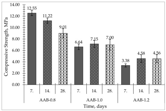 All samples were cured at ambient pressure and temperature (20–23 °C). Sample series AAB-0.8 presented the highest compressive strength: 12.55 MPa on day 7 and 9.01 MPa on day 28. The AAB-1.2 samples had the greatest L/S ratio and exhibited the lowest compressive strength: 3.38 MPa on day 7 and 4.56 MPa on day 28. AAB-1.0 samples exhibited 6.64 MPa on day 7 and 7.00 MPa on day 28.