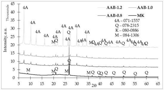 As seen in Figure 6, crystalline phases of quartz (SiO2) and muscovite (KAl3Si3O10(OH)2) could observed after an alkali-activation reaction. In addition to the L/S ratios affecting observation, alkali-activation byproducts—zeolites—were obtained. Following the analysis of the data, zeolites contained in the AABs corresponded to zeolite 4A (Na12Al12Si12O48). Increasing the L/S ratio increased the crystalline phase intensity of zeolite 4A. Zeolite 4A crystalline phase intensities for AAB-0.8 and AAB-1.0 were quite similar, which could be due to the lack of water in the system to initiate the crystallization process [26], but the crystalline phase of 4A in AAB-1.2 was significantly more intensive. The effects of L/S on the formation of zeolites in the AABs consisted of both increased Na2O levels and increased quantities of H2O, i.e., by adding more activation solution, more water entered the system as a whole, which helped the raw materials and formed more zeolite 4A [27].