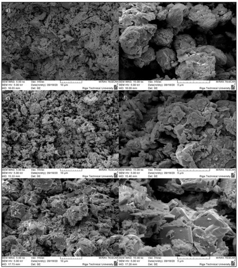 The formation of zeolites with alkali-activated binders would improve overall mechanical strength, as well as sorption capacity because it is proven that different types of zeolites in certain amounts (such as zeolite Na-A, hydrosodalite, zeolite X, faujasite, and analcime) can be formed as secondary alkali-activation products in the structure of an alkali-activated binder (AAB) [14,15,16,17]. Zeolites have a large surface area, a uniform pore size, and a good physical sorption capacity [18], as they are polysilicate-type aluminum silicate minerals consisting of tetrahedral silicon cations (Si4+) and aluminum cations (Al3+) surrounded by four oxygen anions (O2−). Some of the zeolites must have high mechanical strength for use in pressurized gas vessels as adsorbents, so they are blended with binders, which improves their mechanical properties, but concurrently reduces sorption capacity [19,20]. Gleichmann and Chester reported a comprehensive study characterizing zeolites for adsorbent purposes [2,21]. Thereby, the development of zeolite and alkali-activated binder composites could become a promising direction in the development of modified adsorbents with a wider range of applications than practically used adsorbents.