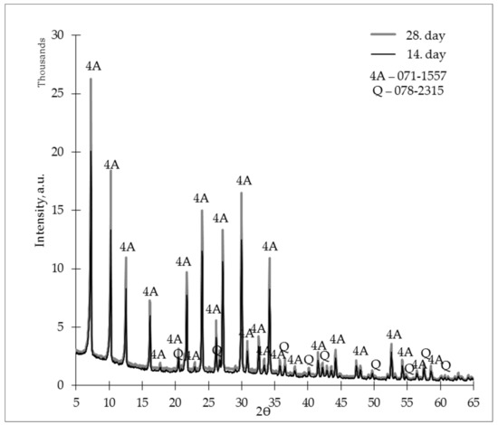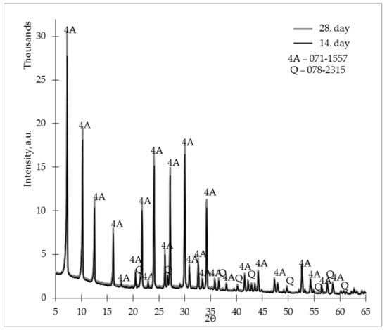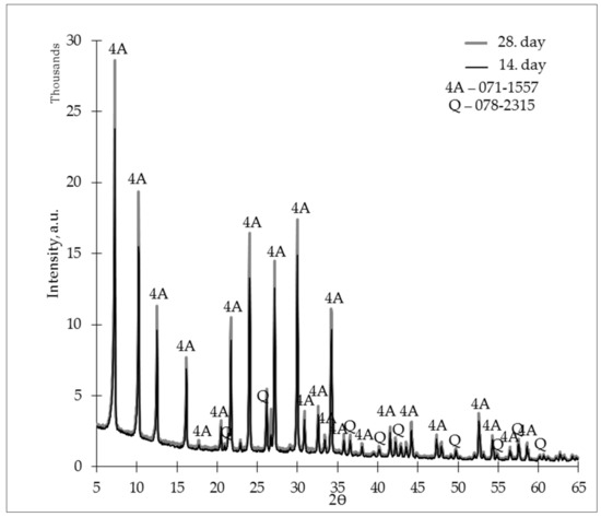Figure 8 shows an X-ray diffractogram for the ZG-0.8 samples, in which we can assess the crystalline phase’s development over time. When comparing the 14th- and 28th-day diffractograms, it could be assessed that zeolites kept developing through time, because the 28th-day diffractograms show a more intense zeolite 4A crystalline phase.