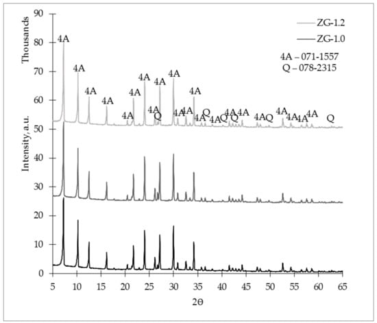 - As in the case of crystalline phase intensities of zeolite 4A in AAB-1.2, ZG-1.2 exhibited the same correlation in which it had the highest crystalline phase intensities, which means that with an L/S ratio of 1.2, a more pronounced crystallinity of zeolite 4A could be achieved.