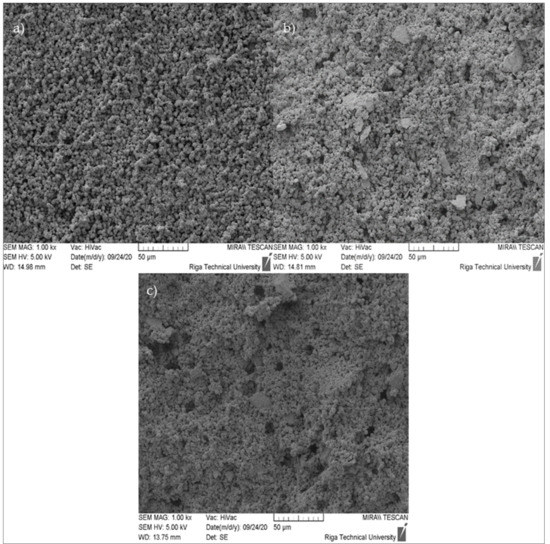 For granular adsorbents, a sufficient mechanical performance is a critical parameter [11,28,29,30]. In this study, physical and mechanical characteristics of MK-based alkali-activated binders and zeolite granules were studied and linked to the microstructures and mineralogical compositions of the final products. The liquid-to-solid ratio (L/S—0.8; 1.0; 1.2) of the 8M NaOH activation solution and the curing time had crucial roles that resulted in varying properties of the obtained products.