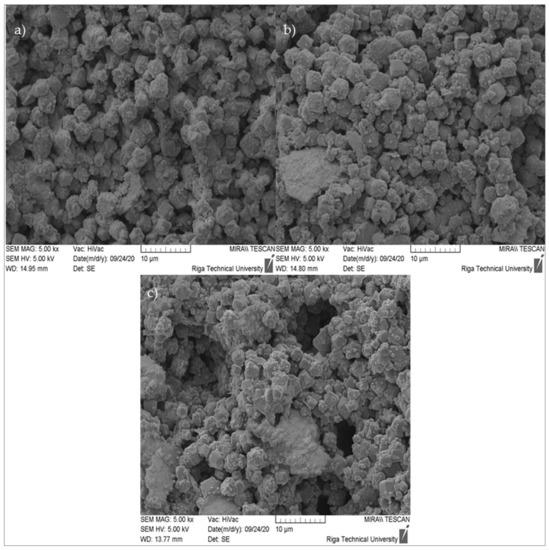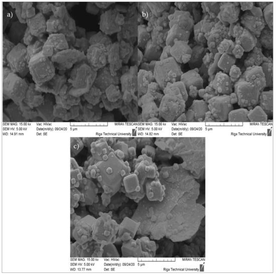 When looking at Figure 7a,c,e, we can see that there were not many pronounced cubic crystal structures that corresponded to zeolite 4A, but when looking at Figure 7b,d,f, showing images that were captured at greater magnification, we can see the crystal formation of a cubic structure much clearer. As shown in Figure 7, without monocrystalline cubic crystals, polycrystalline formations formed from zeolite 4A monocrystals.