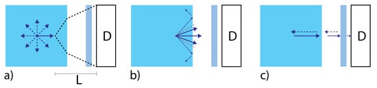 Main sources of light losses at the scintillator (light blue)-photodetector (D) interface: (a) Light collection efficiency (, with L being the distance between the light source and the photodector); (b) total internal reflection ()); and (c) Fresnel losses ().
