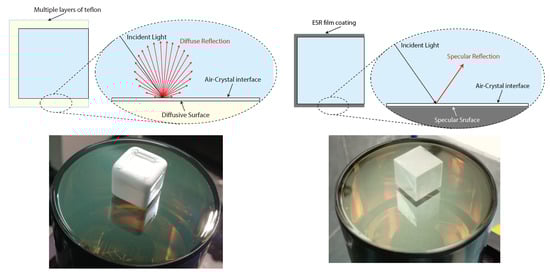 In current radiation detectors based on scintillators, one of the most commonly used techniques to overcome the lateral light losses consists in the use of Teflon wrapping (Figure 3 left). This material is cheap and easily available. It is typically applied on five of the six surfaces of the crystal and acts as a light diffuser, whereby its properties also depend on the thickness of the applied layer [,]. A detailed study of the influence of Teflon wrapping on scintillators can be found in [,].