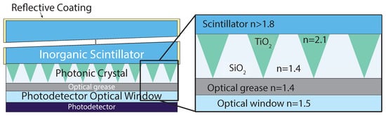 Proposed photonic crystal solution: The scintillator is covered by reflective material and the novel Photonic Crystal (PhC) structure is implemented on the output surface. The PhC is composed of titanium oxide nanocones surrounded by a buffer layer of silicon oxide with a refractive index of about 1.4. The solution allows a stable coupling with the photodetector by means of a refractive index matching material, such as grease.