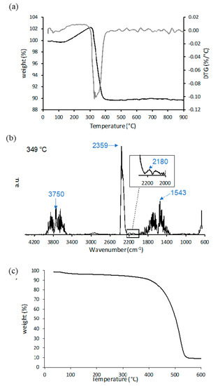 Figure 4 displays the thermal degradation in air of the biochar–BiOx up to 900 °C. The TGA (Figure 4a) shows a slight weight loss of 0.3% below 100 °C, which was related to the desorption of some physisorbed gases. Then, a weight increase of ~2.5% associated with the oxidation of the bismuth was detected until 315 °C. This was followed by thermal degradation of the biochar–BiOx sample, which occurred completely below 400 °C. The maximum degradation of the biochar–BiOx sample was observed at 349 °C, and the IR spectrum acquired at this temperature is shown in Figure 4b. The gases developed were mainly CO2 (2359 cm−1) and water (3750 and 1543 cm−1), being obtained by the degradation of the biochar and the release of some OH surface groups from BiOx, respectively. CO (2180 cm−1) was also observed but in a small amount (Figure 4b inset). The residue of the biochar–BiOx degradation at 900 °C was 89.6%, which was related to the Bi2O3 derived from BiOx in air at high temperature [41,42] and the residue of biochar. Figure 4c shows the TGA of the bare biochar and 12.6% of residue was found. Table 1 listed the calculated weight percentage of BiOx in the composite sample and compared it with the nominal one. The calculated value was higher than the nominal percentage, probably due to the loss of a part of the biochar during the decoration of BiOx.