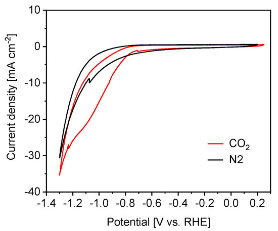 In order to study the electrocatalytic performance of the biochar–BiOx electrode toward the CO2RR, CV was carried out in a N2-purged or CO2-saturated 2.0 M KHCO3 aqueous solution. N2 or CO2 gas was bubbled through the electrolyte for 30 min before the measurements and the same gas flux was maintained during the measurements. Only the HER occurred in the N2 atmosphere at negative potentials, while both the HER and CO2RR happened in the CO2 atmosphere. Hence, it is widely believed that the comparison of the geometric current densities in N2 and CO2 electrolytes could be suggestive for electrode selectivity between the HER and CO2RR [11,43,44]. An electrode that generates a higher geometric current density in the CO2 electrolyte than in the N2 one is usually more selective for the CO2RR with respect to the HER at the corresponding potential. As shown in Figure 5, the current density in the CO2 electrolyte was significantly higher than that in the N2 one at potentials more negative than -0.7 V. This outcome indicated that the biochar–BiOx electrode could have high activity and good selectivity for the CO2RR at negative potentials (<−0.7 V).
