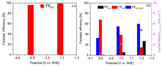 To verify the performance of the biochar–Bi2O3 electrode, CA tests were firstly carried out in 0.1 M KHCO3 electrolyte at different potentials in a customized three-electrode, two-compartment batch cell. An electrode composed of bare biochar was also tested for comparison. As shown in Figure 6a, the biochar showed no selectivity toward the CO2RR, since the faradaic efficiency for the H2 formation was almost 100%. In contrast, the biochar-Bi2O3 electrode showed significant selectivity for the CO and HCOOH formation, especially at higher overpotentials (Figure 6b). However, the current density for HCOOH formation was rather low, probably due to the high resistance of the diluted buffer electrolyte.