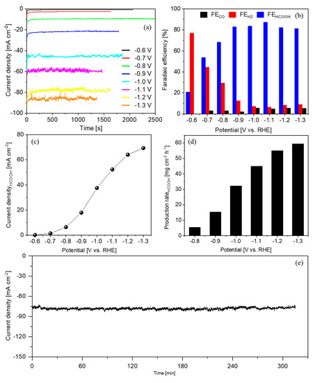 Hence, CA tests were further performed on the biochar–Bi2O3 electrode in a customized flow cell at potentials ranging from −0.6 V to −1.3 V in more concentrated electrolyte (2.0 M KHCO3). The i-t curves at different potentials are shown in Figure 7a. The current density increased as the overpotential increased, which is in agreement with the CV result in the same electrolyte. The major products and their FE values are shown in Figure 7b. H2 was the main product at −0.6 V and its production dramatically reduced at −0.7 V. As the electrode was polarized at more negative potentials, H2 became a minor product and HCOOH became the predominant product, while the FECO remained less than 6% in all the investigated potential range. The selectivity for the CO2RR significantly outcompeted that for the HER at potentials more negatively than −0.7 V, which is consistent with the CV result. It is worth noting that the FE for CO and HCOOH production occupied more than 90% from −1.0 V to −1.3 V. As the main product, HCOOH reached good FE values (>80%) in a wide potential range from −0.9 V to −1.3 V, with a maximum of 87% at −1.1 V.