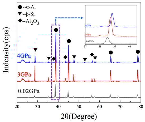 The phase composition of Al2O3/Al-20Si composite prepared under different pressure was analyzed by X-ray diffraction as can be seen in Figure 1. It shows that the Al2O3/Al-20Si composite consists of α-Al phase, β-Si phase and Al2O3 strengthening phase, and no new phase is produced during high pressure solidification. In addition, it can be found that the diffraction peak of α-Al phase is shifted to the higher angel compared with 0.02 GPa. According to Bragg equation and the lattice constant formula of the face center cubic, the lattice constant of α-Al decreases. From the atomic point of view, the radius of Al atom is slightly larger than that of Si atom. With the increase of solidification pressure, more Si atoms replace Al atoms in phase α-Al, which leads to the decrease of lattice constant, and eventually leads to the shift of diffraction peak of α phase to high angle.