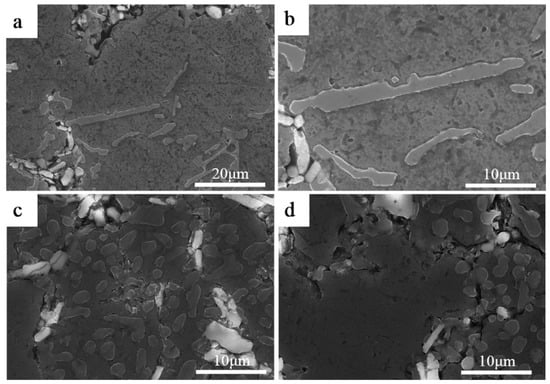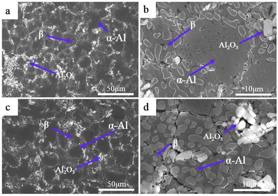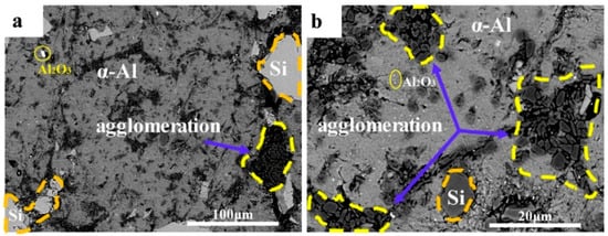 Figure 3 shows the microstructure of Al2O3/Al-20Si composite prepared under different high pressures. It can be seen that the microstructure under 3 GPa is composed of black matrix phase α, spherical eutectic (α + β) phase with network distribution at the grain boundary, and a small amount of Al2O3 strengthening phase with agglomerated distribution. There was no obvious change in the solidification microstructure at 4 GPa. However, the content of eutectic (α + β) phase increased at the grain boundary, and the agglomeration of Al2O3 was greatly improved. Compared with Figure 2, the bulk primary β-Si phase disappears under high pressure, which indicates that the microstructure of Al2O3/Al-20Si composite changes into hypoeutectic. It is because with the increase of solidification pressure, the eutectic point moves to the direction of silicon significantly, and the eutectic temperature also increases [28].