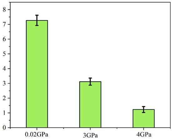 The length diameter ratio of eutectic Si phase prepared under different pressures is counted, and the results are shown in Figure 5. It shows that the length diameter ratio of eutectic Si phase is 7.68 at 0.02 GPa. After high pressure solidification, eutectic silicon gradually spheroidized. When the solidification pressure is 3 GPa and 4 GPa, the length diameter ratio of eutectic Si decreases to 3.26 and 1.32, respectively. The results show that high pressure solidification can refine the eutectic Si grains of Al2O3/Al-20Si composites.