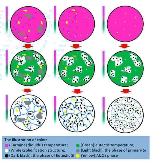 In conclusion, the microstructure formation mechanism of high pressure solidified Al2O3/Al-20Si composite can be revealed in Figure 6, in which magenta, green and white indicate three different crystallization temperatures, namely liquidus temperature, eutectic point temperature and completely solidification temperature. Under the condition of 0.02 GPa, when the temperature is below the liquidus, the black primary silicon begins to nucleate and grow. When the temperature is below the eutectic temperature, eutectic transformation occurs to form α-Al and eutectic silicon phases. The Yellow alumina phase is dispersed. This may be since Al2O3 was used as nucleation substrate for both primary silicon and eutectic silicon. At high pressure, the agglomeration of Al2O3 strengthening phase first appeared and gradually disappeared. At the same time, the growth of primary silicon was inhibited, while the nucleation and growth of α-Al phase were promoted. The eutectic silicon is spheroidized and uniformly distributed under pressure.