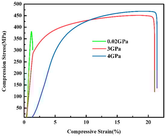 Figure 7 shows the compressive stress-strain curves of Al2O3/Al-20Si composites prepared under different pressures. The results show that the strength prepared at 0.02 GPa is 381.5 MPa and the plastic toughness is about 1%. When the solidification pressure is 3 GPa, the compressive strength of the material reaches 451.5 MPa and the compressive strain is about 21%. When the pressure is 4 GPa, the compressive strength of the material is further improved to 469.1 MPa, and the compressive strain is about 21.5%. The compressive strength of the material under high pressure increased by 18% and 23%, respectively. The plasticity increases about 20 times. It is due to the uneven dispersion of the powder under low pressure, resulting in more pores, which seriously affects the density of the composite. At the same time, it cannot prevent the formation of hard brittle primary silicon phase and promote the spheroidization of eutectic silicon under ambient pressure.