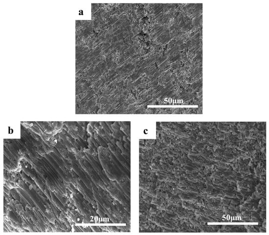 The fracture morphology of Al2O3/Al-20Si composites under different pressures is shown in Figure 8. It can be seen from Figure 8a that the fracture mode of the alloy during solidification at 0.02 GPa is typical cleavage fracture, a large number of smooth cleavage planes are distributed in the fracture surface. When the solidification pressure rises to 3 GPa, as shown in Figure 8b, the fracture mode is still cleavage fracture, but its degree decreases. There is no large cleavage plane on the fracture surface, and a small number of dimples have appeared. When the solidification pressure further rises to 4 GPa, as shown in Figure 8c, it can be seen that the fracture mechanism has undergone essential changes, with a large number of dimples distributed on the fracture surface, indicating that the fracture mode of the alloy is quasi-cleavage fracture.