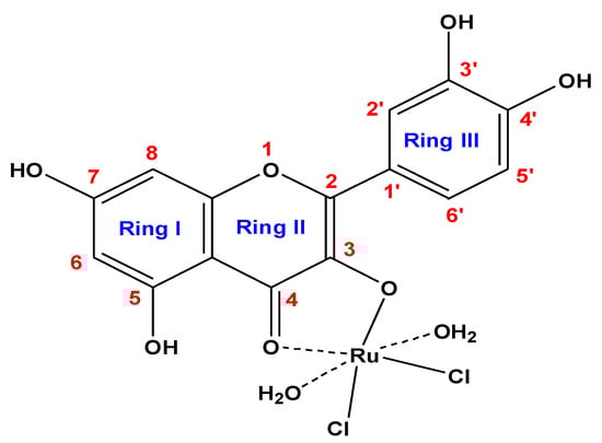 All chemicals (quercetin and ruthenium(III) chloride hydrate) were purchased from “Sigma-Aldrich” (St. Louis, MO, USA) and then used without purification. The ruthenium(III) complex with Q was synthesized by the following method. Analyses and corresponding models are summarized as follows: