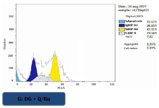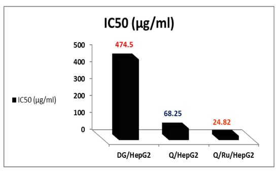 MTT assay was performed to detect the effects of DG, Q and RuIII/Q on the proliferation of HepG2 cells and to determine the effective dose of test drug relative to concentration. MTT is a pale-yellow substrate that yields a product of dark blue formazan product through cleaving by living cells. Active mitochondria are required for this process, so freshly dead cells cannot break down significant amounts of MTT. Tetrazolium ring is cleaved by mitochondrial dehydrogenases of viable cells, producing purple formazan crystals that are insoluble in aqueous solutions. Formazan crystals are dissolved in acidified isopropanol. The formed purple solution can be measured using a spectrophotometer. Increase or decrease in cell number causes a change in the amount of formazan produced, that detects the degree in cytotoxicity effect of the tested material. MTT is reduced to insoluble purple MTT formazan crystals, by mitochondrial lactate dehydrogenase enzyme (LDH), and the pyridine nucleotide cofactors, NADH and NADPH as substrates [].