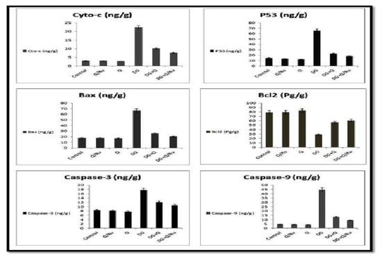 Antioxidants are the compounds that can scavenge the free radicals through the implication of the defense antioxidant enzymes Cu/Zu SOD and GPx, by direct non-enzymatic actions. Quercetin (Q) is a bioflavonoid which is present in many foods and vegetables. In foods, quercetin is present in a form of glycoside (with sugar groups attached) and is being deglycosylase to quercetinaglycone prior to absorption into the small intestine []. The Q is an effective compound in preventing the oxidative injury that may be caused by the cellular apoptosis and it is more potent agent as compared to other antioxidant compounds, such as GSH and vitamins like vit “C” and “E” []. Additionally, Q protects against the hepatic damage and this might be by reducing the overexpression of the NO synthase induced by different types of stimuli []. Q belongs to the flavonoids family, which is present in most of the plants including fruits and vegetables and having antioxidant activities. Quercetin has anti-inflammatory and anticancer activities along with its capturing activities of “OH−”, “H2O2”, and “O2−” [].