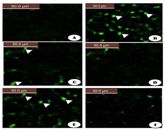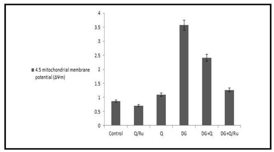 The mitochondria of the hepatic tissues were isolated from all groups. Briefly, the mitochondrial ROS generation was evaluated using rhodamine 123 (Rh123) probe at a final concentration of 10 μM for 30 min at 30 °C. An increase in fluorescence intensity indicates an increase in the collapse of MMP [].