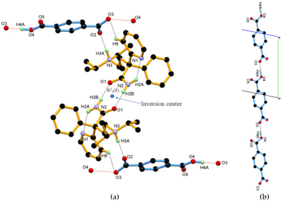 With this in mind, our intention is to explore the novel solid form of DPA by using different acidic coformers and to see their effect on the conformation of DPA and molecular packing in crystal structures, because there is only one crystal structure of DPA phosphate salt reported by Kawamura and Hirayama [16] in the CSD. In the current study, we have selected Terephthalic acid (TA) as the salt former, which has a para disubstituted carboxyl group on the benzene ring (Figure 1). In this article, we discuss the preparation method of DPA:TA salt and carry out X-ray single-crystal structural analysis; the obtained new salt was further evaluated by solid-state characterization.