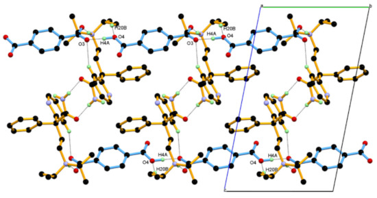 Such dimeric units are extended through linear and strong O4–H4A∙∙∙O3¯ and short and non-linear C20–H20B∙∙∙O4 hydrogen bonds with the neighboring unit translated dimeric units along the b-axis to generate a ladder-like network where the protonated DPA dimer units join the 1D chains of the TA anion, as shown in Figure 4. In this association, the O3¯ oxygen atom of the carboxylate anion of TA accepts hydrogen from the carboxyl OH (O4–H4A) of the neighboring unit translated TA anion in the O4–H4A∙∙∙O3¯ hydrogen bond along the b-axis. Whereas, in turn, carboxyl hydroxyl (O4–H4A) O4-oxygen accept C20–H20B hydrogen of unit translated protonated DPA molecules in short and non-linear C20–H20B∙∙∙O4 hydrogen bonds.