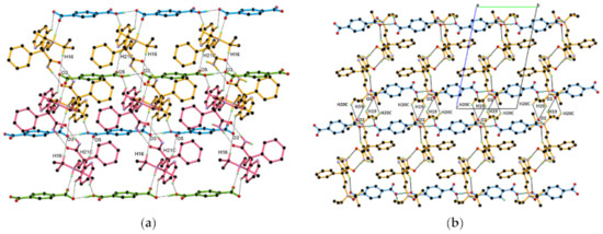 Packing of the 1D dimeric unit chain (a) along the a-axis through C16–H16∙∙∙O3¯, C21–H21C∙∙∙O5 interaction to generate a two-dimensional (2D) layer (b) along the ac-diagonal through C19–H19∙∙∙O2¯ and C20–H20C∙∙∙O2¯ interaction to generate a 2D layer.
