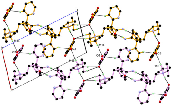 DPA:TA salt crystalized in the centrosymmetric triclinic P-1 space group containing one protonated DPA and one TA anion in the asymmetric unit revealed that the molecular salt is in the 1:1 molar ratio. The salt pair, i.e., the protonated DPA and TA anion in the asymmetric unit linked by a strong charge, assisted the N3+–H3A∙∙∙O2¯ hydrogen bond and the C9–H9∙∙∙O3¯ hydrogen bond. In the crystal structure of DPA:TA salt, protonated DPA displays an intramolecular N2-H2A∙∙∙N1 hydrogen bond by donating second amide hydrogen N–H to the N-atom of 2-pyridine moiety in the S11(6) ring motif, along with other C-H∙∙∙O intramolecular interactions, namely C15-H15B∙∙∙O1 and C17-H17B∙∙∙O1, which stabilize the conformation protonated DPA molecules in the salt, as shown in Figure 2a. The crystallographic information and geometrical parameters for the hydrogen bonding interaction are summarized in Table 1 and Table 2.