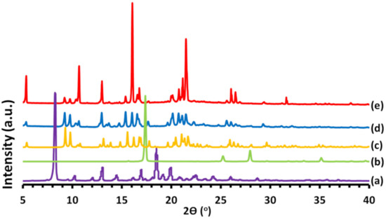 Powder X-ray diffraction (PXRD) patterns of (a) commercial DPA, (b) TA, (c) simulated DPA:TA, (d) DPA:TA salt obtained from slurry method, and (e) DPA:TA salt obtained from slow solvent evaporation.
