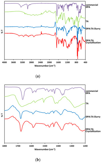 FT-IR spectra, (a) 4000–400 cm−1 and (b) 1800–1200 cm−1, of commercial DPA, TA, and DPA:TA salt obtained from the slurry method and DPA:TA salt obtained from the slow evaporation method.