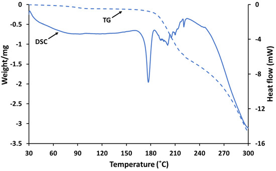 DSC and TG measurements were recorded with a Thermo plus EVO2-DSC 8230 and a Thermo plus EVO2-TG8120 TG-DTA, respectively (Rigaku Co., Tokyo, Japan). The DSC sample (~3 mg) was placed into an aluminum-crimped pan and the TG sample (~4–5 mg) was placed into an aluminum-open pan, and both were measured at a speed of 5°C/min from 25 to 300°C under nitrogen gas (flow rate = 50 and 100 L/min, respectively).