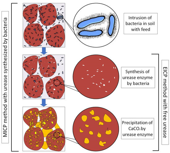 Figure 1 presents the EICP and MICP mechanisms. The precipitation of CaCO3 by microbes was tested with and without urea by Golovkina et al. [45], who inferred that two metabolic routes—autotrophic and heterotrophic—were responsible for the precipitation of CaCO3 in the soil. Precipitation with urea was initiated with the usual urea hydrolysis, and the urea-free medium also successfully precipitated calcite at low pH values with different bacteria strains.