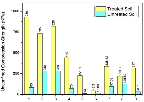 The biotreatment of soils is well understood for its degree of effectiveness by UCS values [36,88,89,90]. Ali et al. [91] stated that the UCS test is most trusted to ascertain the effectiveness of soil stabilization methods. Sharma and Ramkrishnan [92] studied soils (fine grained) treated with MICP and observed the improvement in the UCS value of soil. They also inferred that the particle packing plays an important role in improving soil strength and even leads to improved bearing capacity, reduced settlement and permeability, and diminished shrink-swell characteristics of soils. The development of pore pressure can also be stopped with soil treatment. Strength enhancement in soils treated with biocementation methods is mainly achieved because of the adhesion of soil grains due to calcite precipitates in soil voids. Figure 2 shows a comparison of UCS values obtained for the soils before and after the biotreatment.