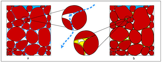 Schematic representation of soil mass: (a) Flow paths allowing water to percolate through soil mass. (b) Representation of the blockage of pore throats by calcite precipitation and the formation of calcite biofilms on soil grains, leading to narrowing/blockage of flow paths and reducing permeability after biotreatment.