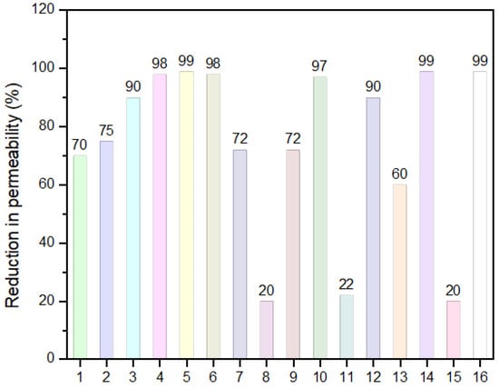 Maximum permeability reductions in percentage achieved by different researchers in their studies after soil biomineralization. 1—Yasuhara et al. [100], 2—Whiffin et al. [81], 3—Soon et al. [119], 4—Nemati and Voordouw [32], 5—Moghal et al. [120], 6—Handley-Sidhu et al. [110], 7—Zamani and Montoya [108], 8—Ferris et al. [115], 9—Gui et al. [116], 10—Proto et al. [63], 11—Ragusa et al. [121], 12—Cunningham et al. [122], 13—Van Paassen [123], 14—Ivanov et al. [124], 15—Al Qabany and Soga [125], 16—Ivanov and Chu [126].