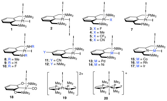 The set of complexes 1–20 (see Figure 1) was chosen to cover a range of different substituents and central transition metals. Complex 1 is the original van Koten complex [38] with an I atom coordinated to the central Pt atom in equatorial position relative to the aryl ring, and the I2 ligand bonded to Pt in axial position. Complexes 2–6 are modifications of reference 1 with different substituents replacing the iodine atom bonded to Pt in equatorial position. In complex 7 the original NMe2 groups are replaced with PMe2 groups and the complexes 8–10 are characterized by modifying Me2 in the NMe2 groups. Complexes 11–12 have different aryl ring substituents in para position relative to the metal coordination center, while complexes 13–17 are modification of reference 1 regarding exchange of the central transition metal. In 15–17 aryl is replaced with pyridine. Complexes 18–20 are other model compounds of general interest [160,161,162]. Throughout the manuscript we use the label M–I for the bond between the metal and iodine atom of the I2 ligand and the label I–I represents the iodine–iodine bond of the I2 ligand coordinated to the metal.
