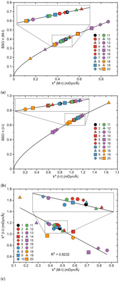 Figure 3a,b present the power relationship between the BSO n and values for the M–I and the I–I bonds, respectively, which transforms force constant values into more commonly applied bond strength orders. According to Table 1, the BSO n values of the M–I bond are in a range between 0.186 and 0.591, which corresponds to relatively weak metal ligand bonding. The strongest M–I bond is found for complex 17 in which the central Pt metal of the original van Koten complex is replaced with Ir, whereas the weakest M–I bond is found for the doubly positively charged Pt complex 19. As reflected by the values in Table 1 all M–I bonds are covalent in nature. The BSO n values for the I–I bonds range from 0.502 and 0.903 are somewhat stronger and reach for 19 with a value 0.903 almost the strength of the I–I bond in I2 (BSO n = 1). In Figure 3c the relationship between (M–I) and (I–I) is depicted. Although the correlation is not perfect (R = 0.8232), it reflects the general trend that a stronger M–I bond corresponds to a weaker I–I bond for a particular molecular complex, in line with the CT mechanism discussed above and in accordance with our previous studies on transition-metal I2 complexes revealing an inverse proportional relationship between the M–I and I–I bond strength [70]. Furthermore, there is also a practical implication, it shows that (M–I) and (I–I) data can be used in a straight-forward manner for the fine-tuning of the iodine bonding in pincer complexes.